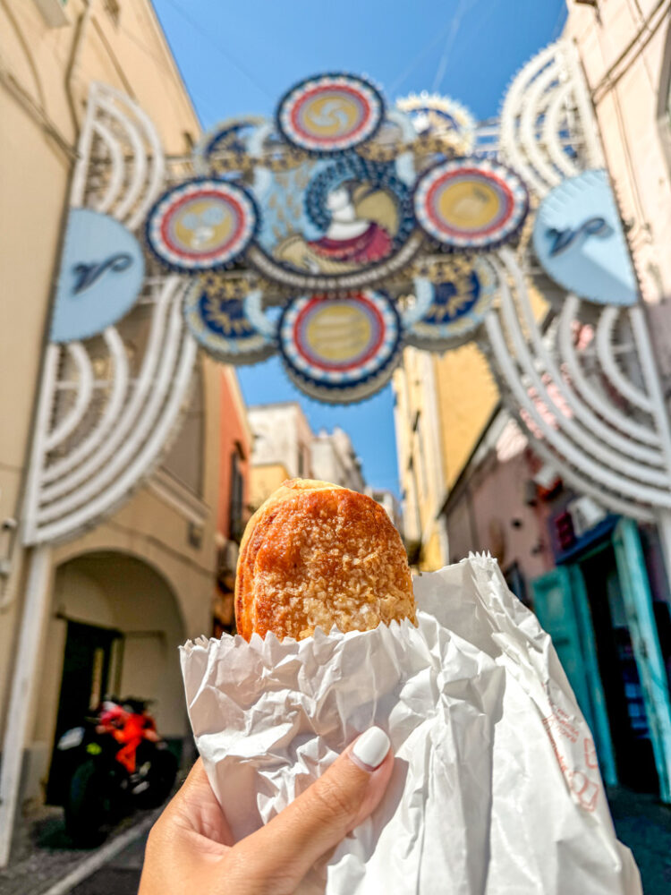 Once you step off the ferry at Marina di Procida, pop into Pasticceria Bar Roma (right by the port) and start your day the Procidani way – with a lingua di Procida and a coffee. This flaky, lemon custard-filled pastry is light, tart, sweet, and absolutely perfect with an espresso. Since it was invented right here on the island, it feels only right to enjoy it at the start of your adventure!