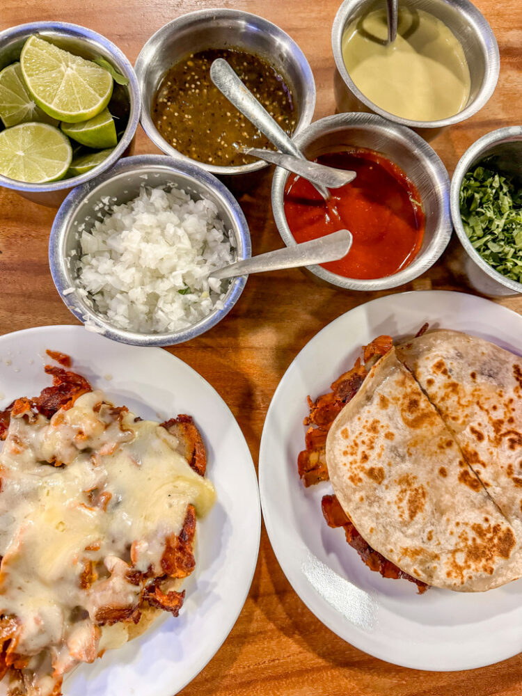 I ordered both the tacos al pastor and an al pastor volcano (covered in cheese) – and quickly realized it was way too much food so saved the volcano for breakfast the next morning, haha. Plus, my limonada con frutos rojos drink was HUGE!