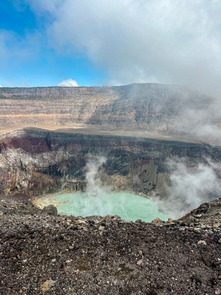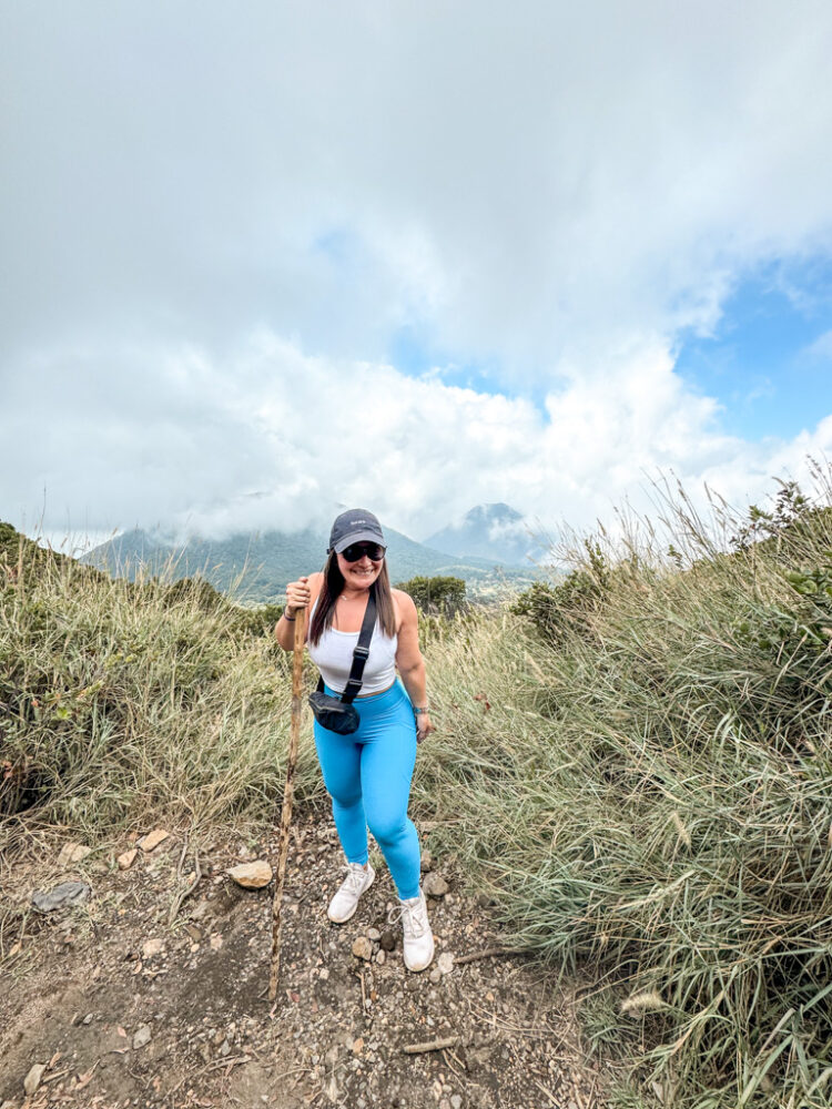 The hike itself is about 4 hours round-trip and considered moderate. We climbed through cloud forest, rocky trails, and volcanic gravel, gaining around 1,500 feet in elevation. Don’t worry – it’s not a brutal climb, and people of all ages do it, but I definitely felt it for sure.